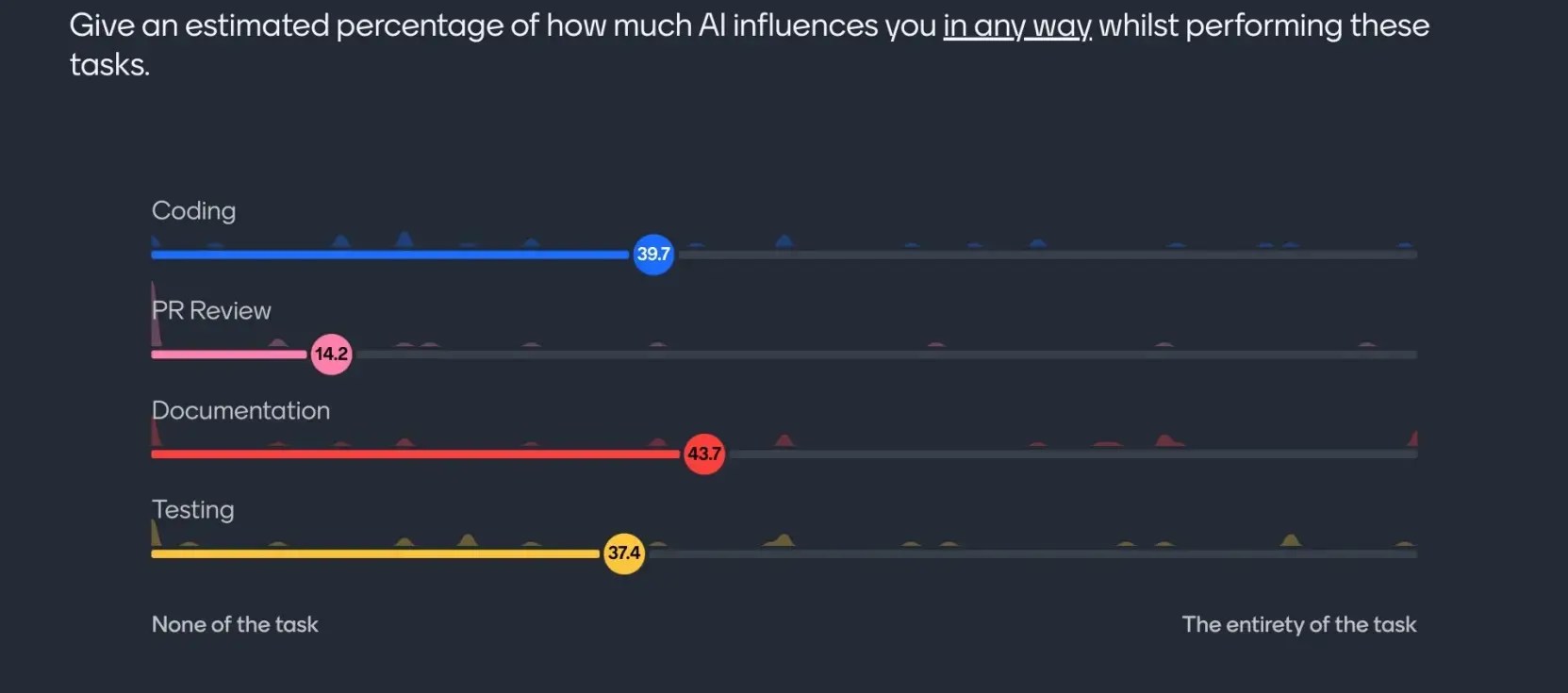 In fact, using AI has become a critical part of our development process. Our developers are using AI mainly to assist with writing code and to search for answers, which is very much in line with the Stack Overflow survey. A significant percentage is also using it to document their code, as well as generating content or synthetic data.